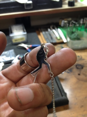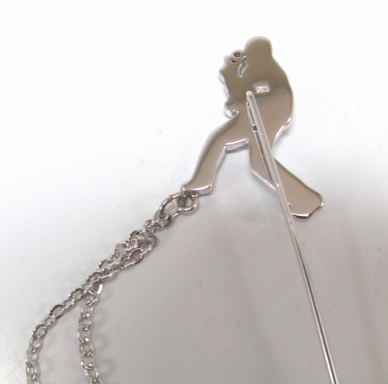 今回のラペルピンの特徴は、ポスト(ピン)を斜めにつけたことです。これは、スーツの襟の角度に合わせてありますので、この角度に合わせて襟に差し込むと、イーネ♪ポーズは地面と水平になる仕掛けです。