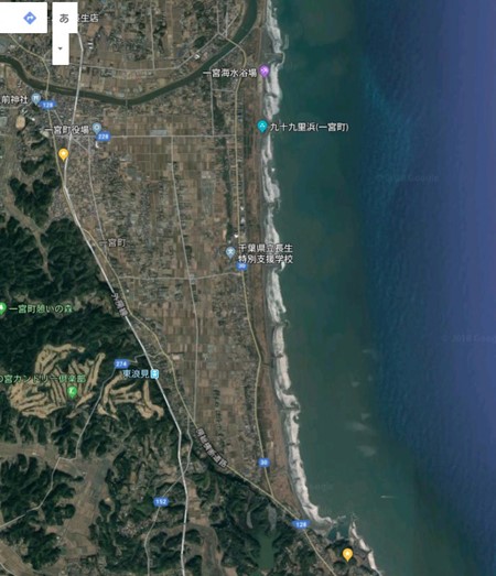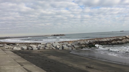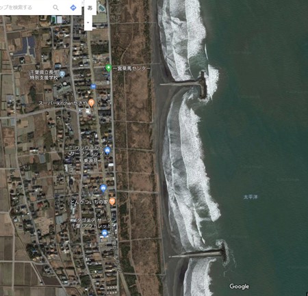 九十九里浜は北は飯岡から南は一宮町まで約70㎞の弓なりの砂浜で、途中に岩場は一切ありません。利根川から流れ出る上流からの堆積土が親潮で北から運ばれ、夷隅地区以南の古くからの岩場(房総半島の南半分はチバニアンという古くから存在した岩場の地層)が波で浸食された浸食土が黒潮で北に運ばれて形成されている長い砂浜です。