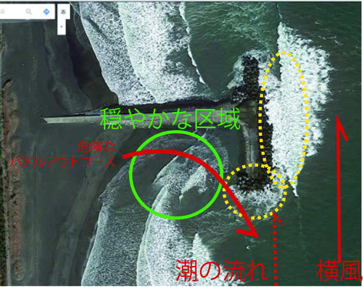 堤防南のまん丸の黄色破線で囲った部分が最も危ないのです。ここは、よほどのパドル力があってもなかなか抜けられないほどの渦が巻き、潮の流れがパドルしたい方向の逆になっています。そして、ここで巻き込まれると、テトラが横一列に並ぶ泡で真っ白のどうにもこうにもパドル出来ないエリアに流され、テトラポッドに打ち付けられてしまいます。