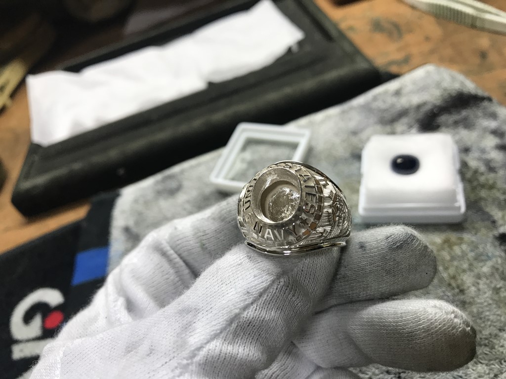 もうひとつのケースとしては、主にチャンピオンリングなど体積の大きなリングの場合、「内部ス穴」と言う空洞がアリの巣のように地金内部に存在する事があり、そこにも洗浄水が残留して、乾燥工程でしみ出してくる事もあります。